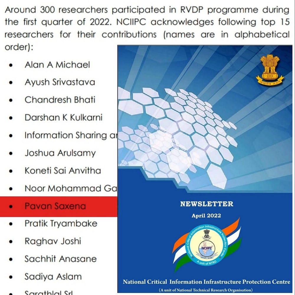 In return, I did not get anything for this. But overall after reporting 40+ vulnerabilities in the Government domain to National Critical Information Infrastructure Protection Centre (NCIIPC), I got my name mentioned in April 2022 Newsletter.