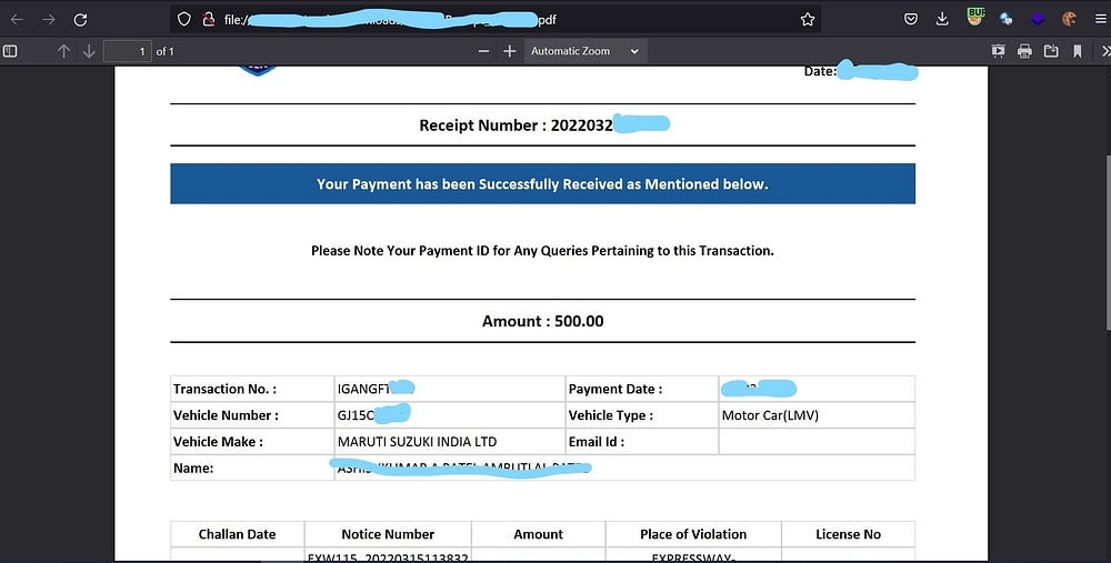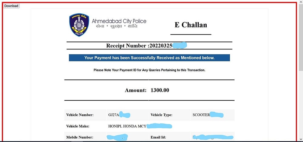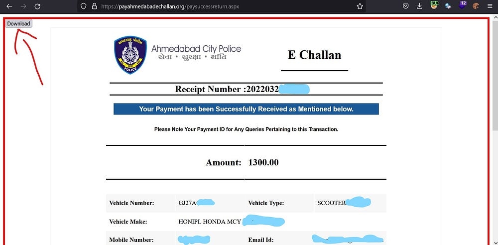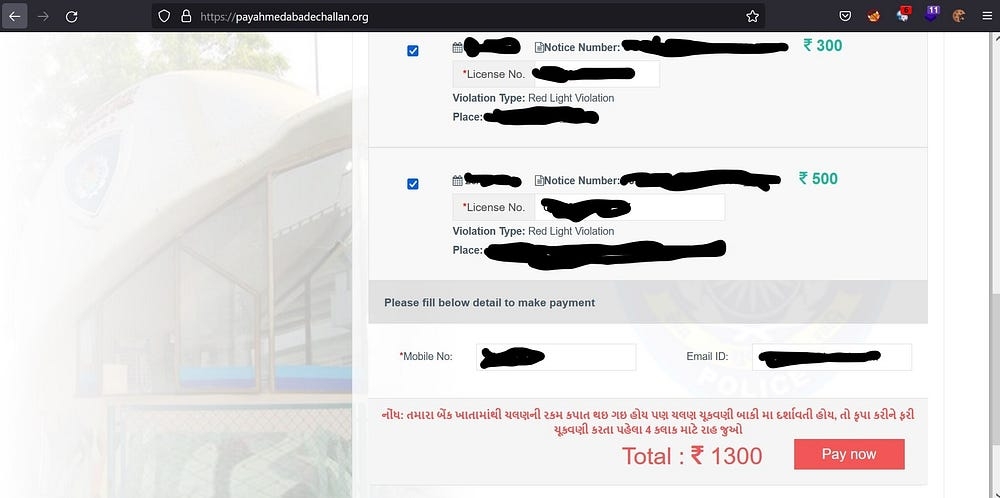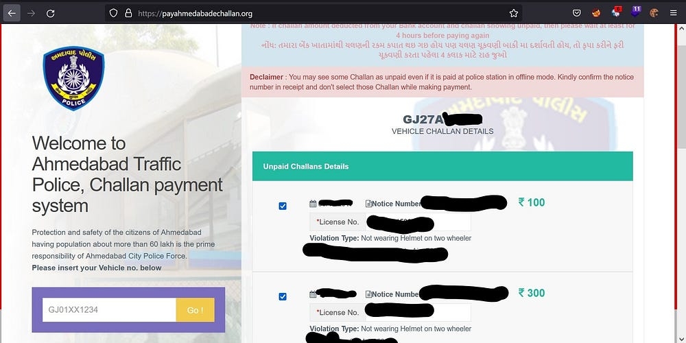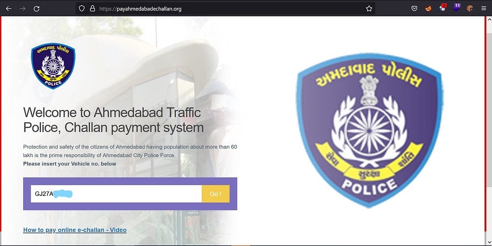 The vulnerability was found on the website which is used to pay Challan online to Ahmedabad Traffic Police. So the basic requirement was to have a vehicle registered under Ahmedabad RTO which has some amount of challan in it.