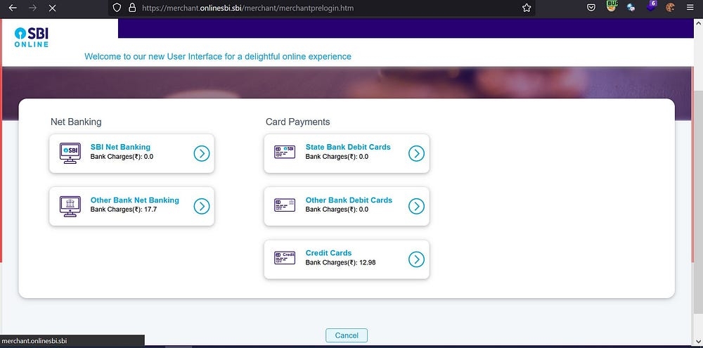 After manipulating the value of challan, we get a payment gateway of SBI.