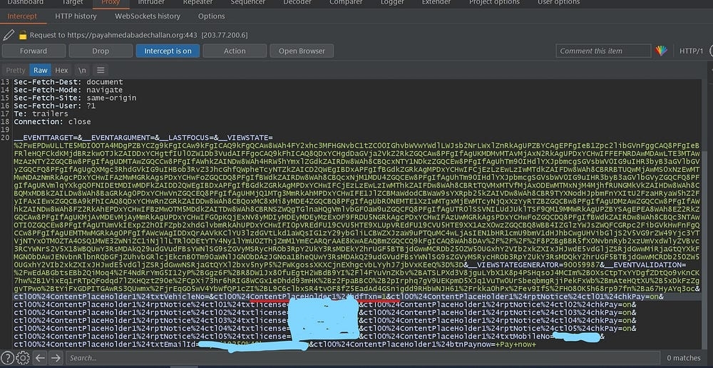 On intercepting the payment request, we can see the amount of challan going from there. On Changing its value to some lower value still, it would pass the payment. Check the POCs attached below.