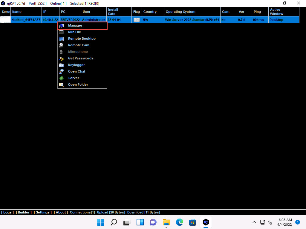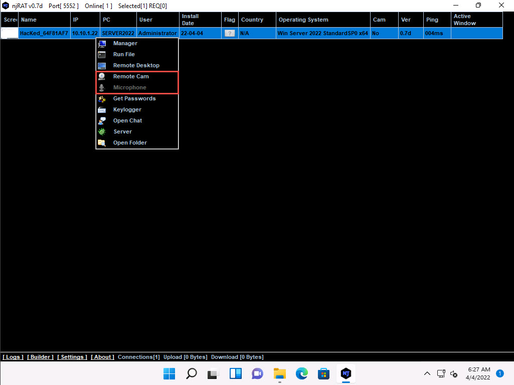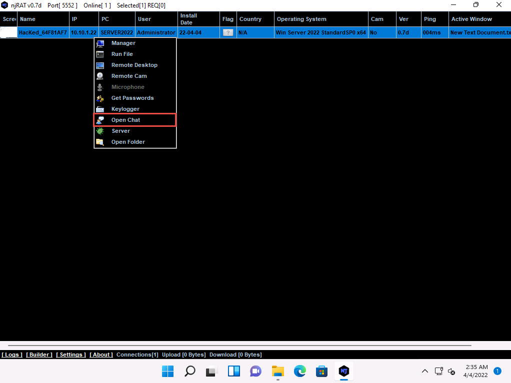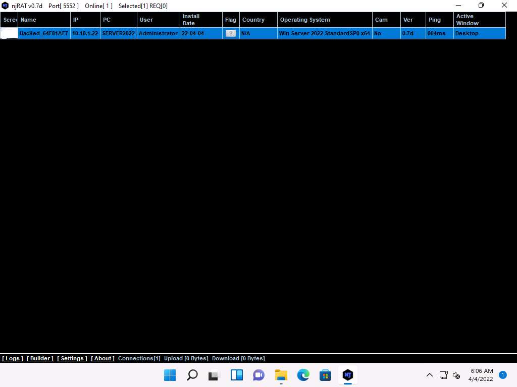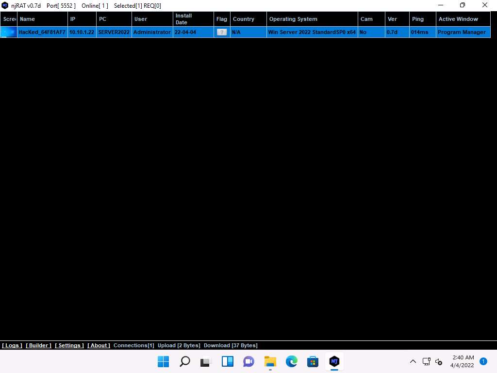 Screenshot Click Windows 11 to switch back to the Windows 11 machine. Maximise njRAT GUI window. As soon as the victim (here, you) double-clicks the server, the executable starts running and the njRAT client (njRAT GUI) running in Windows 11 establishes a persistent connection with the victim machine, as shown in the screenshot.
