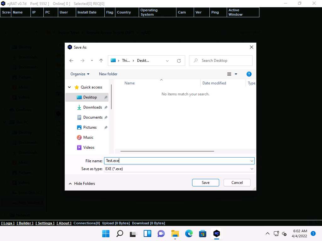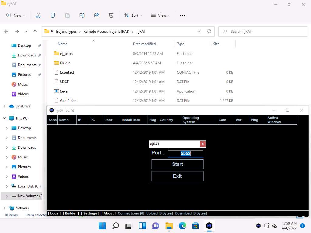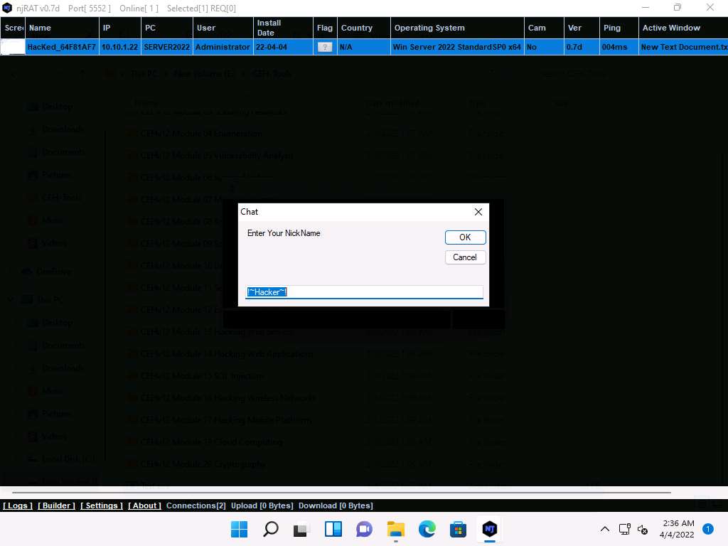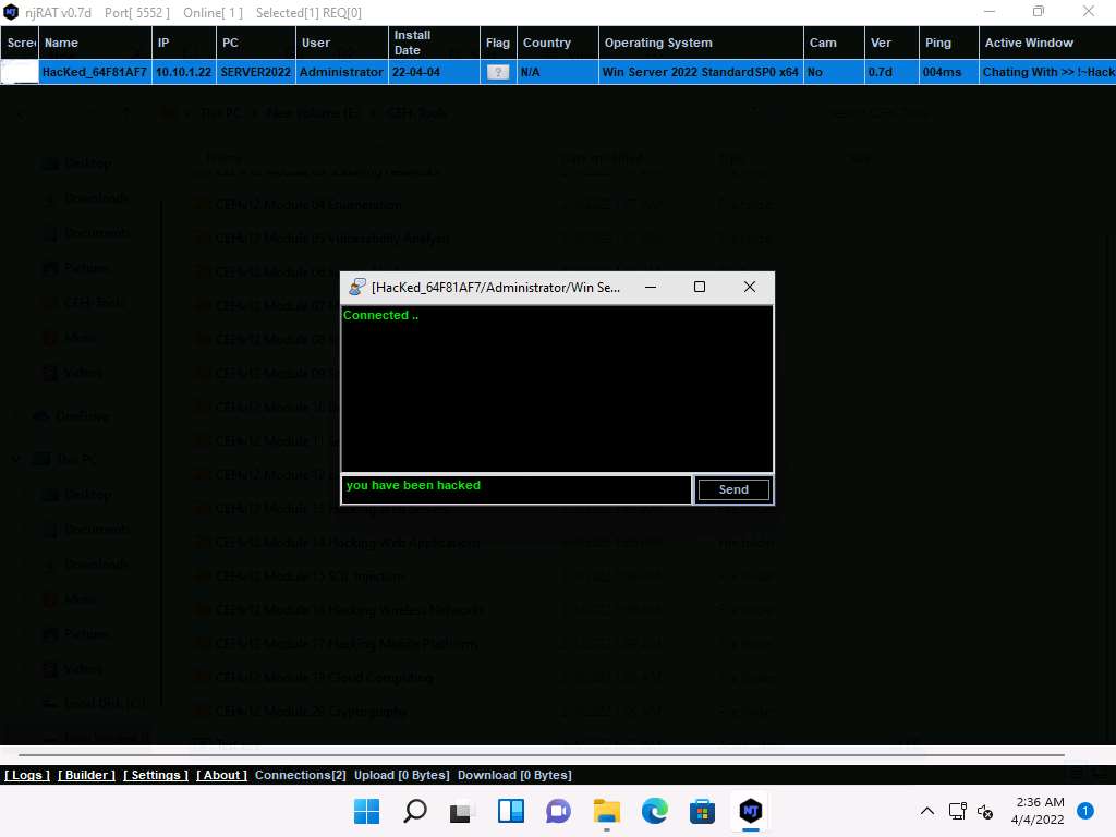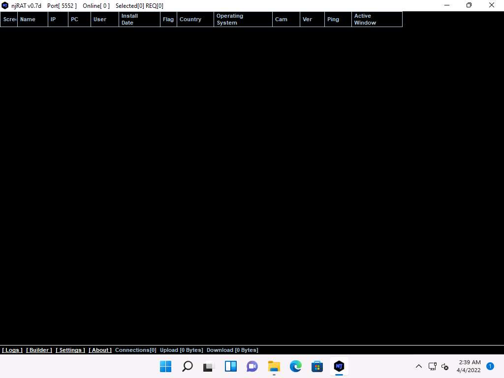 Screenshot Click Windows 11 to switch back to the Windows 11 machine. Maximise njRAT GUI window. As soon as the victim (here, you) double-clicks the server, the executable starts running and the njRAT client (njRAT GUI) running in Windows 11 establishes a persistent connection with the victim machine, as shown in the screenshot.