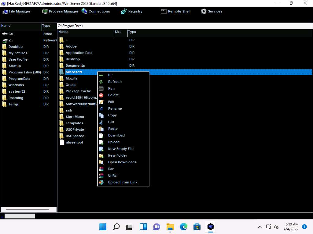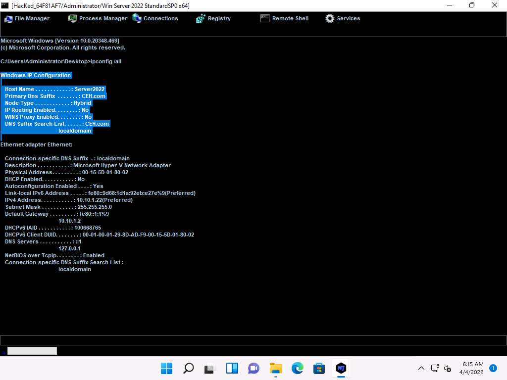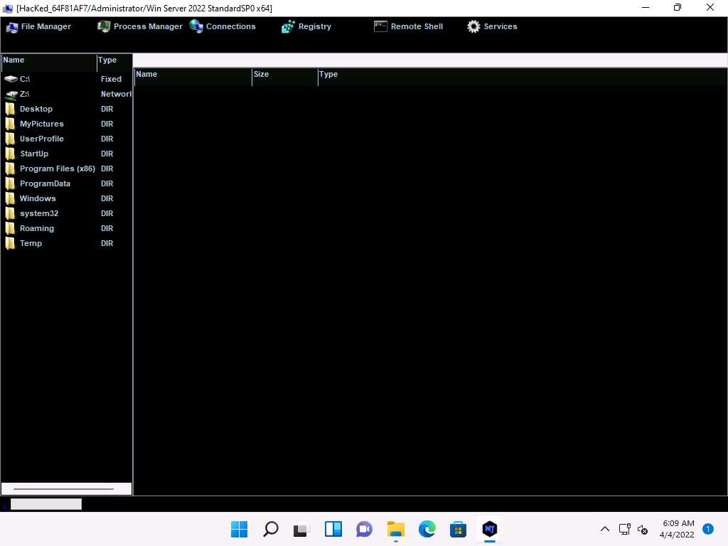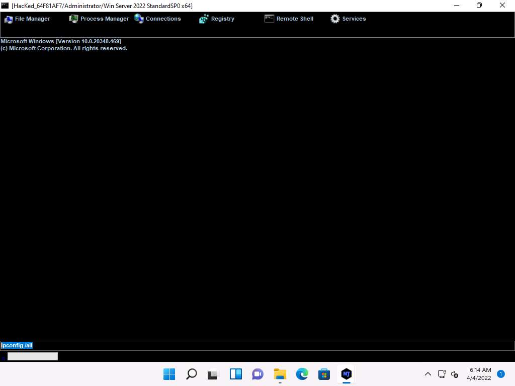 Screenshot Click Remote Shell. This launches a remote command prompt for the victim machine (Windows Server 2022).