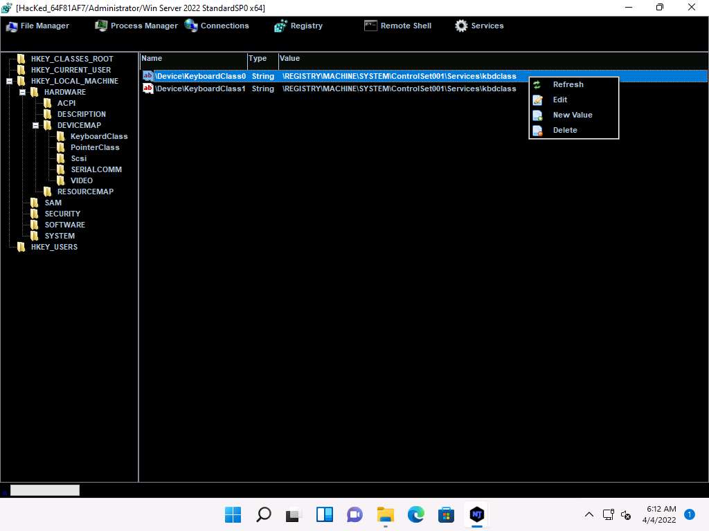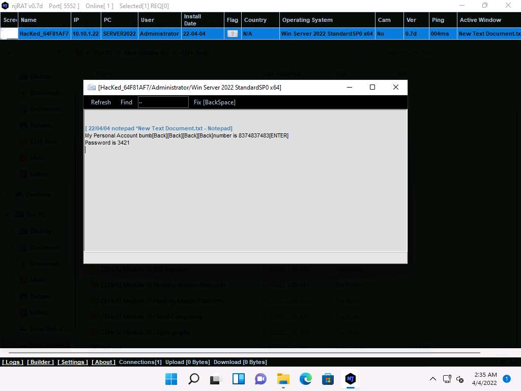 The window displays all the keystrokes performed by the victim on the Windows Server 2022 machine, as shown in the screenshot.