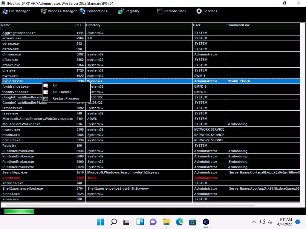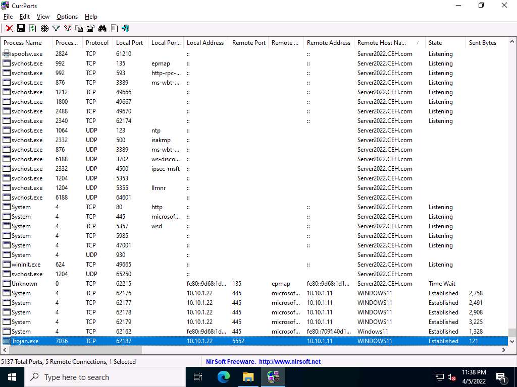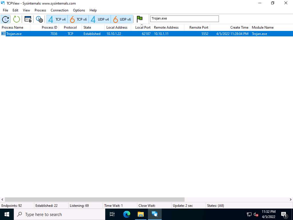You can observe that the Trojan.exe malicious program is running on the Windows Server 2022 machine. You can see details such as Remote Address and Remote Port.
