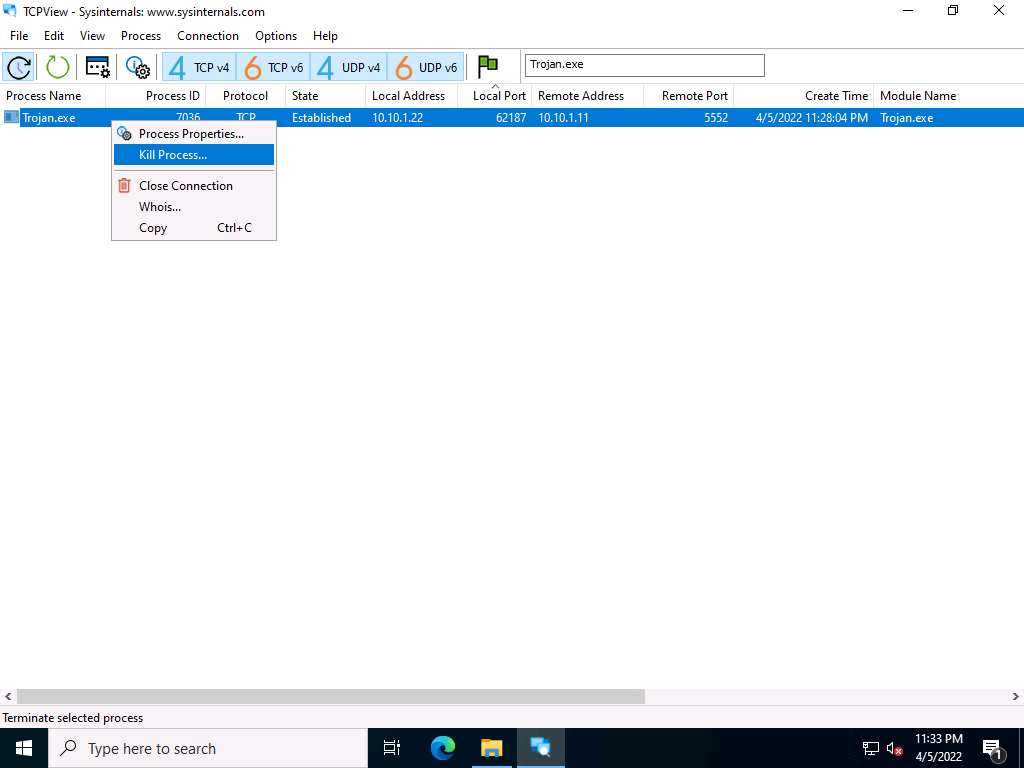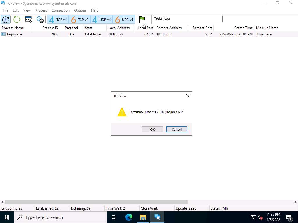 Screenshot Normally, if a TCPView dialog box appears, click OK to terminate the process. However, for this task, do not Kill the process in this step as we are going to use this running process for the next task; click Cancel.