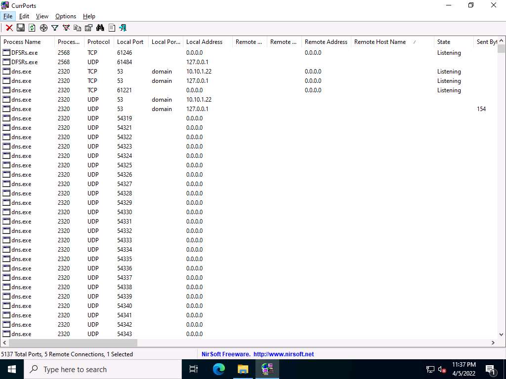 The CurrPorts window appears, displaying a list of currently open TCP/IP and UDP ports on the machine.