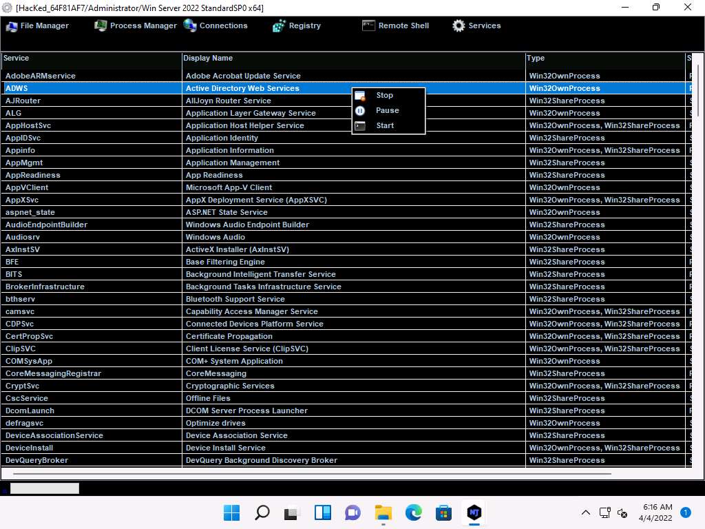 In the same way, click Services. You will be able to view all services running on the victim machine. In this section, you can use options to start, pause, or stop a service.
