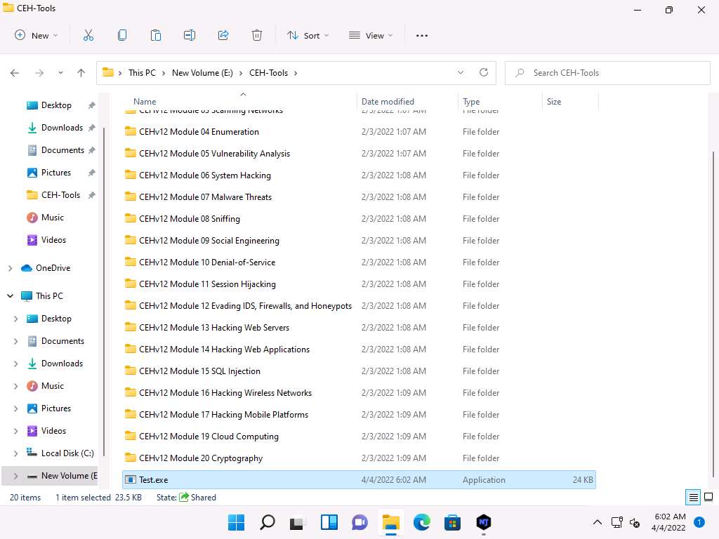 In this task, we copied the Test.exe file to the shared network location (CEH-Tools) to share the file.