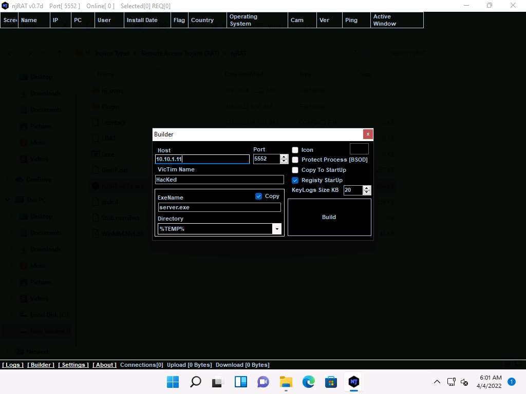 2022-04-04_14-30-07.jpg The Builder dialog-box appears; enter the IP address of the Windows 11 (attacker machine) machine in the Host field, check the option Registy StarUp, leave the other settings to default, and click Build.