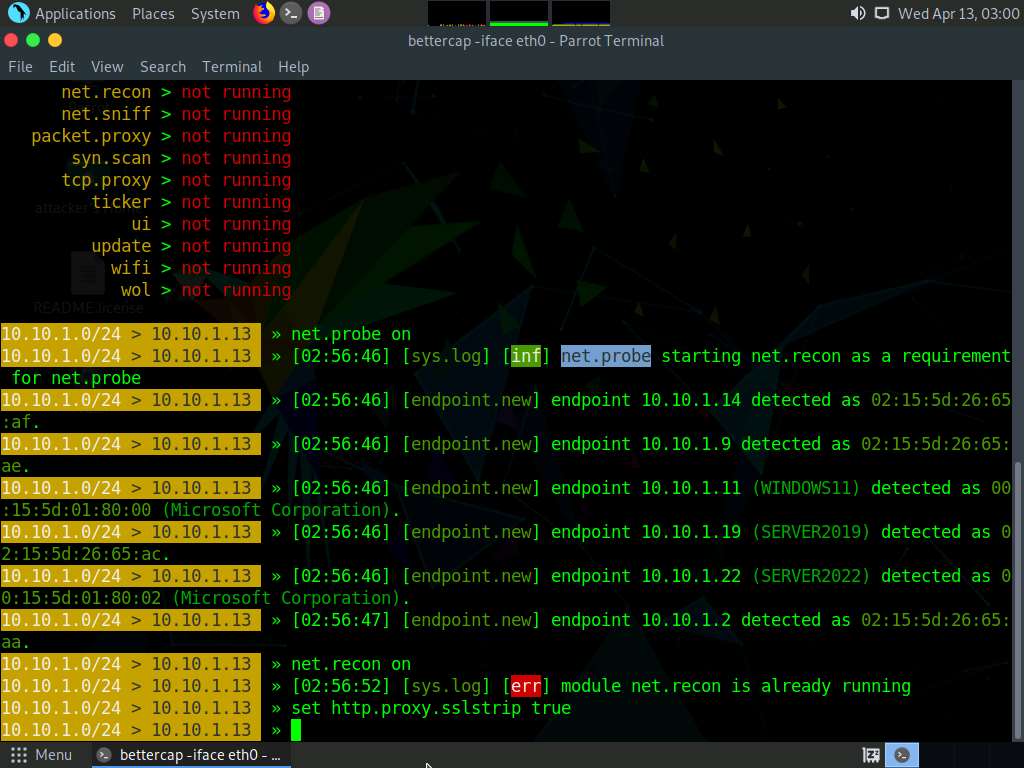 Screenshot Type net.probe on and press Enter. This module will send different types of probe packets to each IP in the current subnet for the net.recon module to detect them.