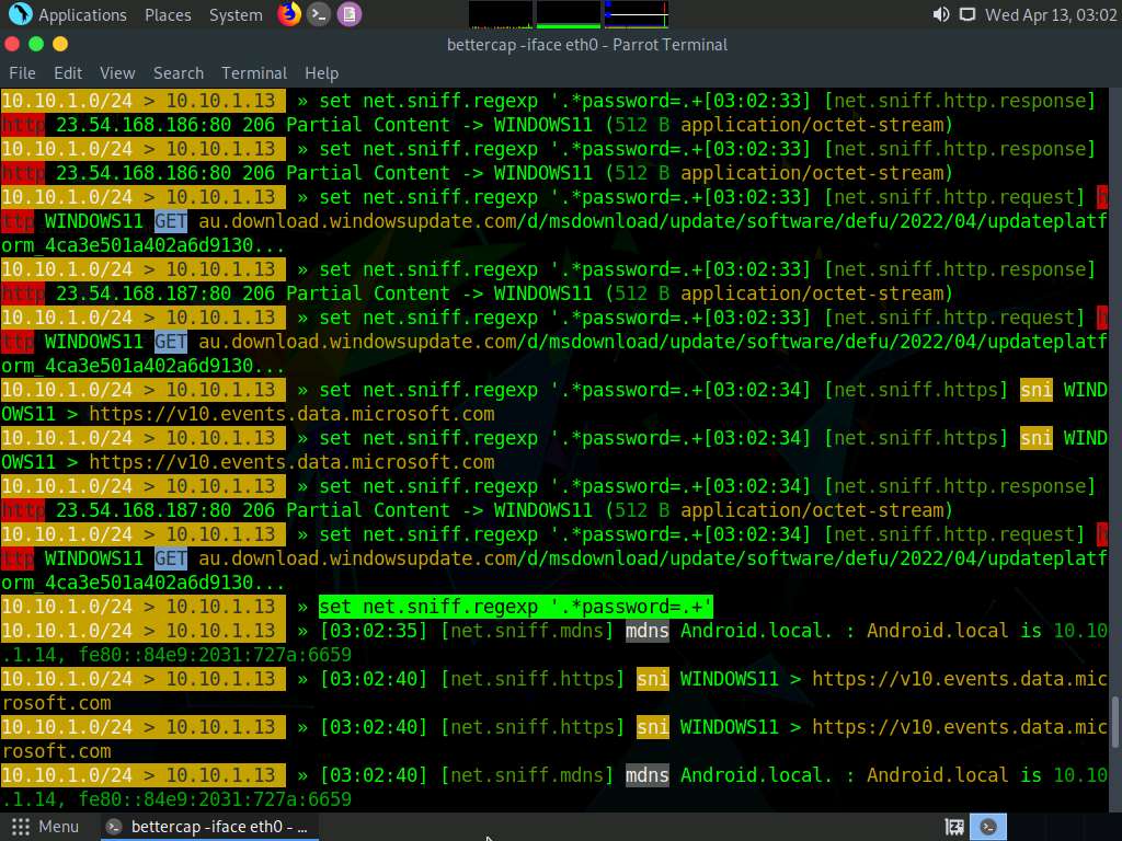 Screenshot Type set net.sniff.regexp โ.*password=.+โ and press Enter. This module will only consider the packets sent with a payload matching the given regular expression (in this case, โ.*password=.+โ).
