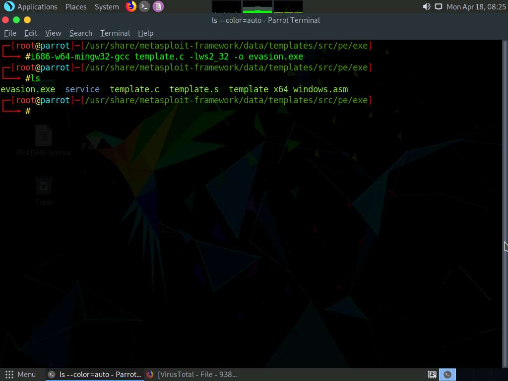 Type i686-w64-mingw32-gcc template.c -lws2_32 -o evasion.exe and press Enter, to recompile the standard template.