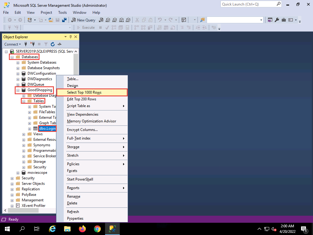 In the Microsoft SQL Server Management Studio window, right-click dbo.Login, and click Select Top 1000 Rows from the context menu.