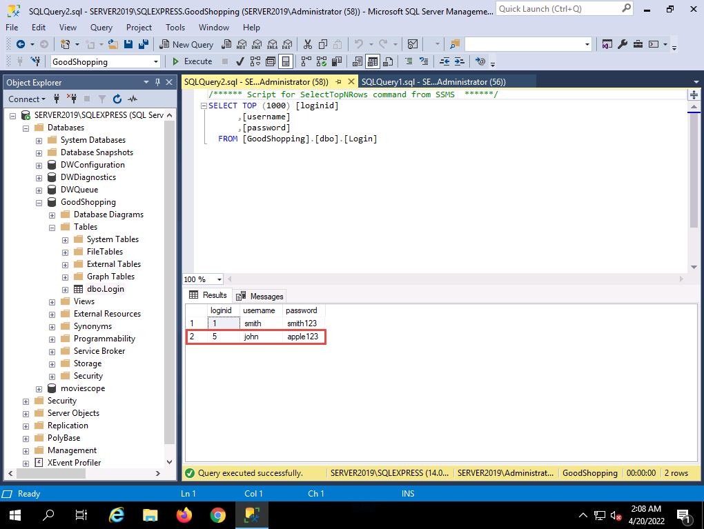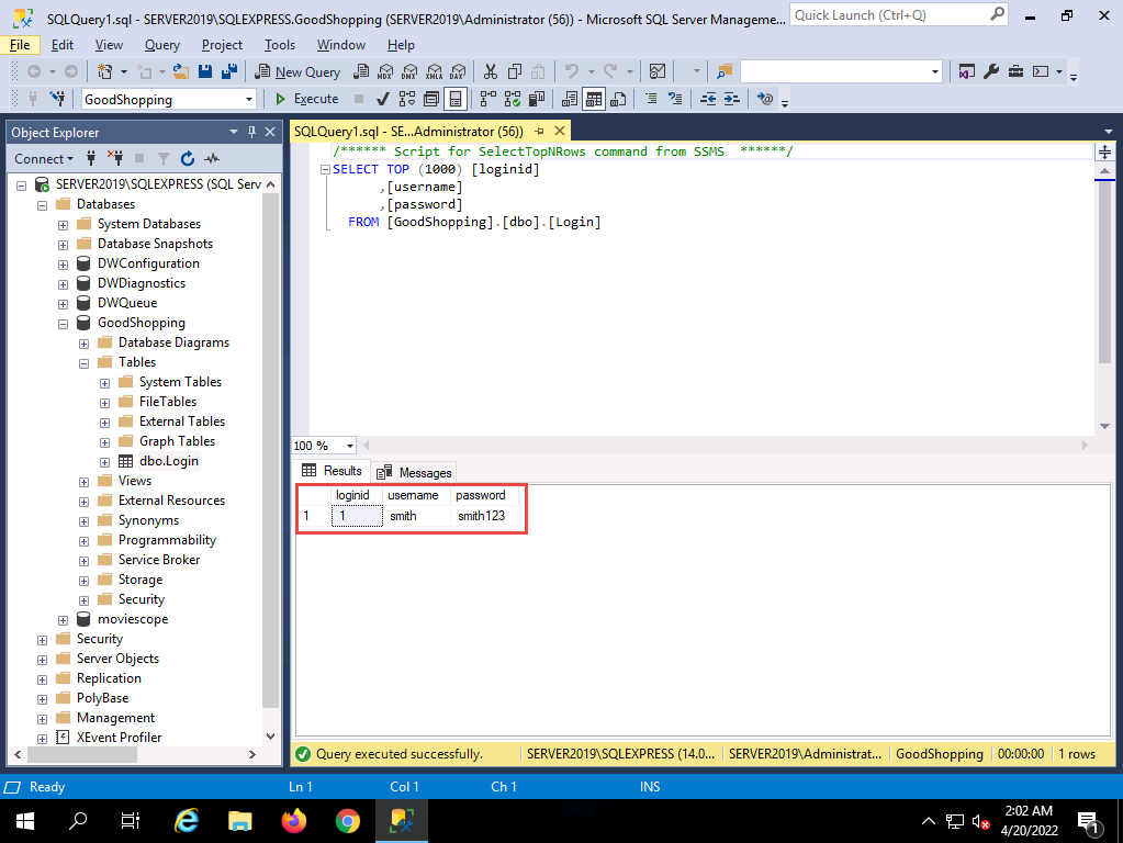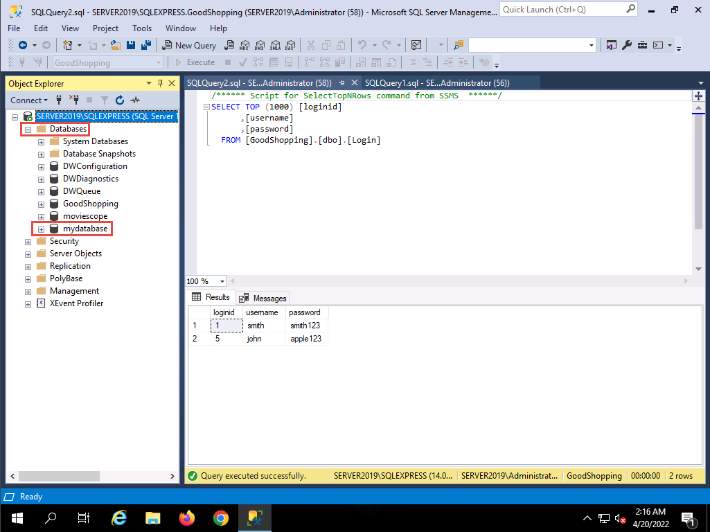 2022-04-20_14-48-12.png To see whether the query has successfully executed, Click Windows Server 2019 to switch back to the victim machine (Windows Server 2019); and in the Microsoft SQL Server Management Studio window, click the Refresh icon.