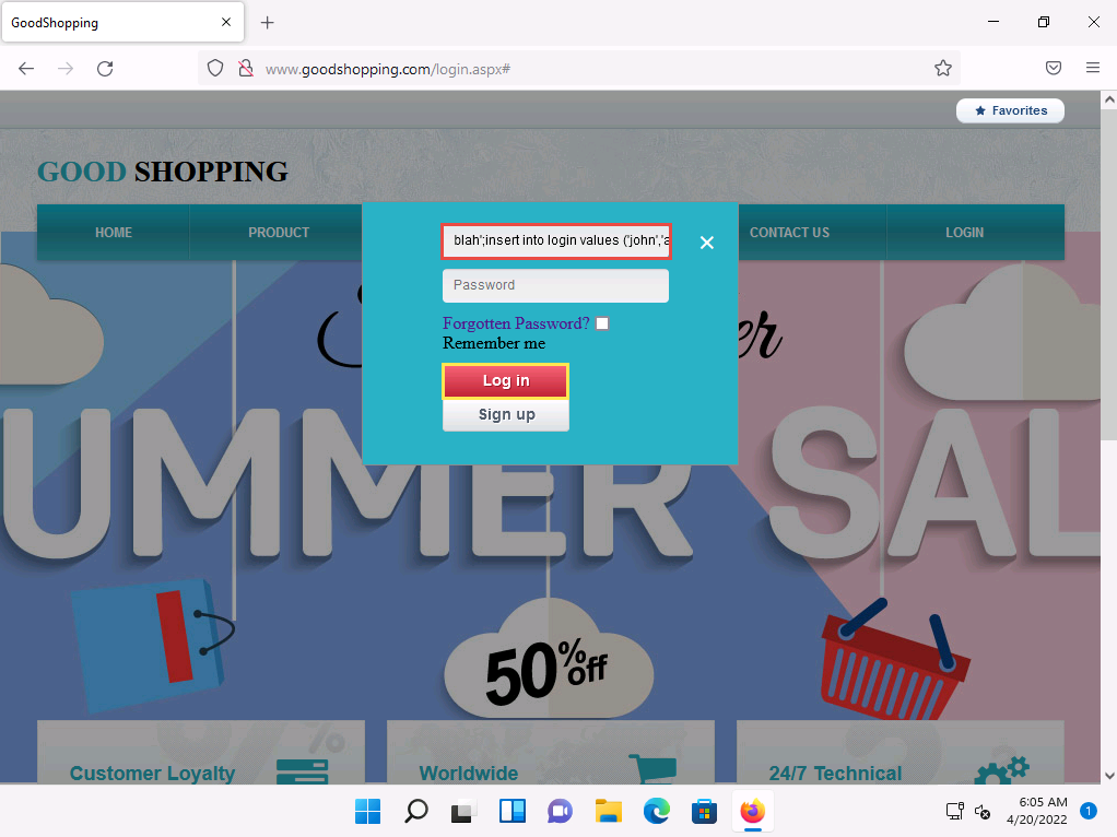 Now, we shall create a user account using the SQL injection query. Before proceeding with this sub-task, we shall first examine the login database of the GoodShopping website.