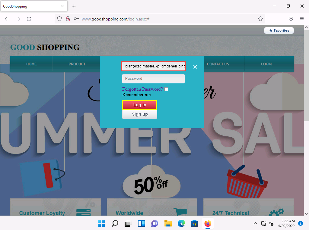 2022-04-20_14-52-30.png The SQL injection query starts pinging the host, and the login page shows a Waiting for www.goodshopping.com⦠message at the bottom of the window.