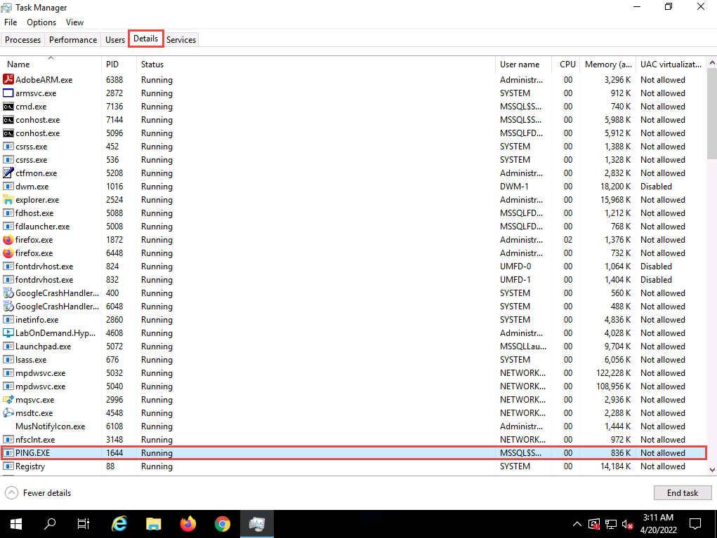 Navigate to the Details tab and type p. You can observe a process called PING.EXE running in the background.