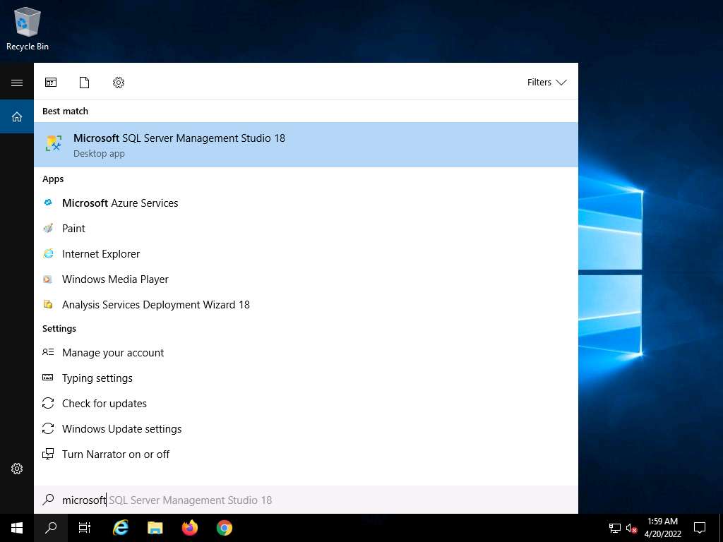 Click the Type here to search icon in the lower section of Desktop and type microsoft. From the results, click Microsoft SQL Server Management Studio 18.