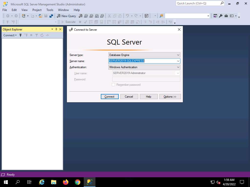 Screenshot Microsoft SQL Server Management Studio opens, along with a Connect to Server pop-up. In the Connect to Server pop-up, leave the default settings as they are and click the Connect button.